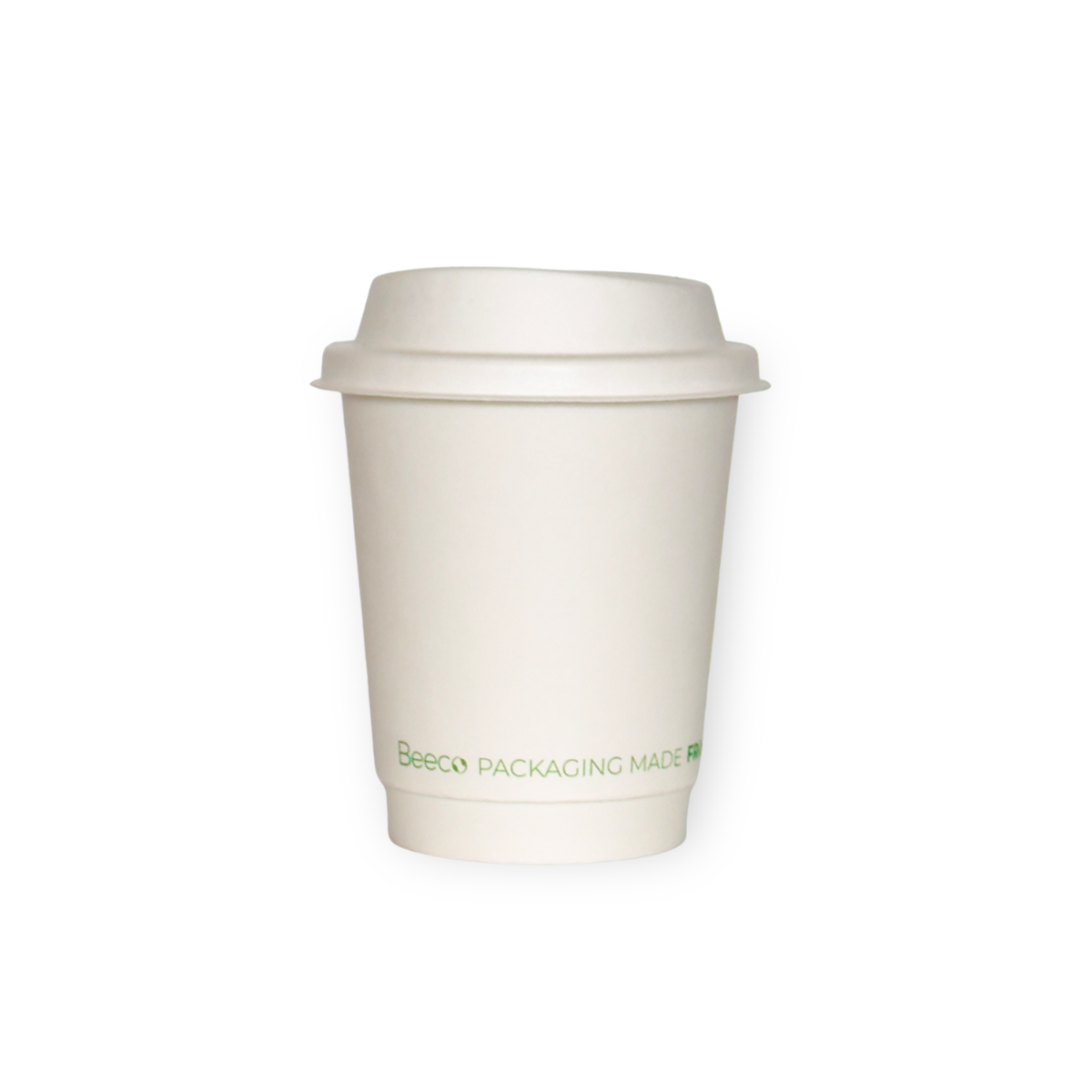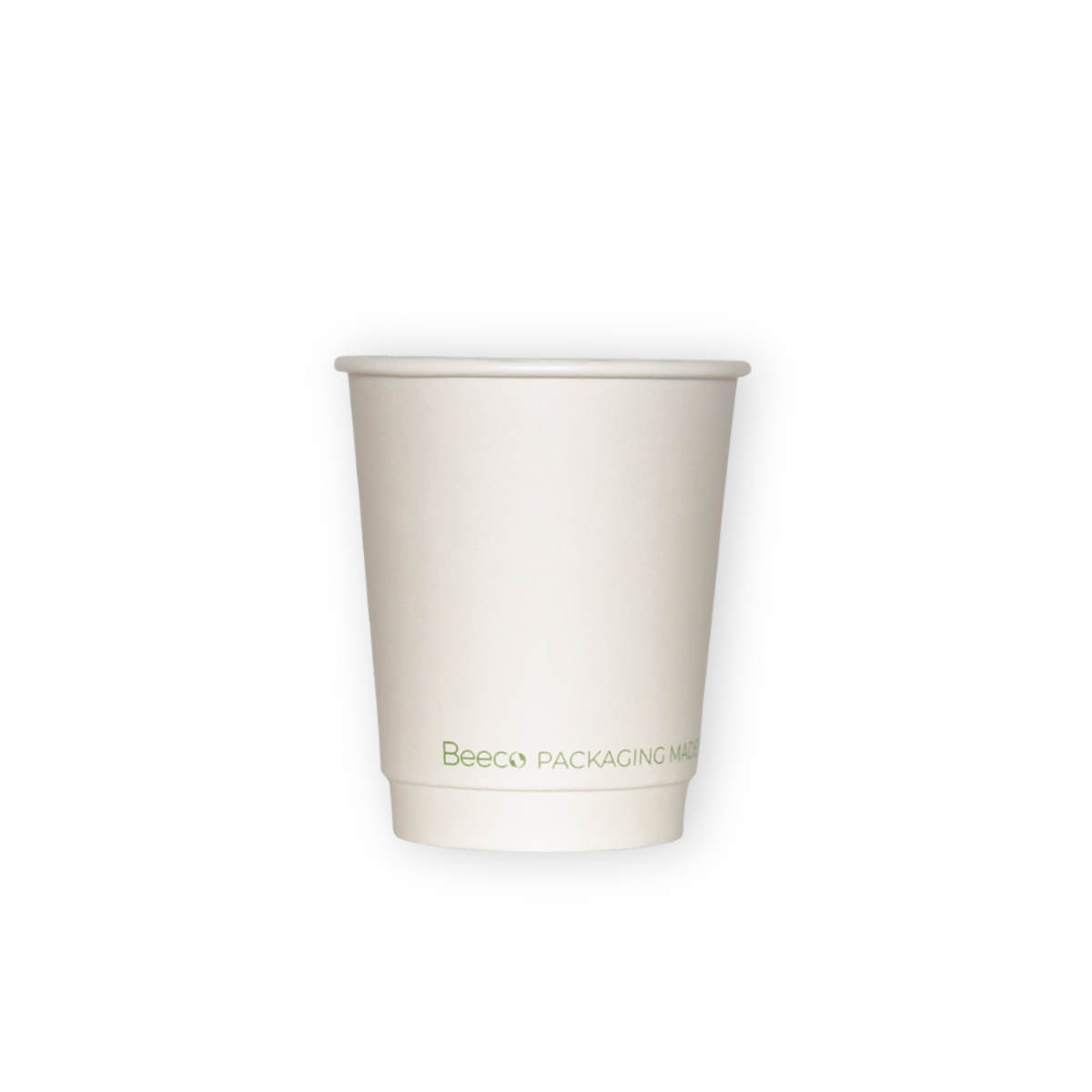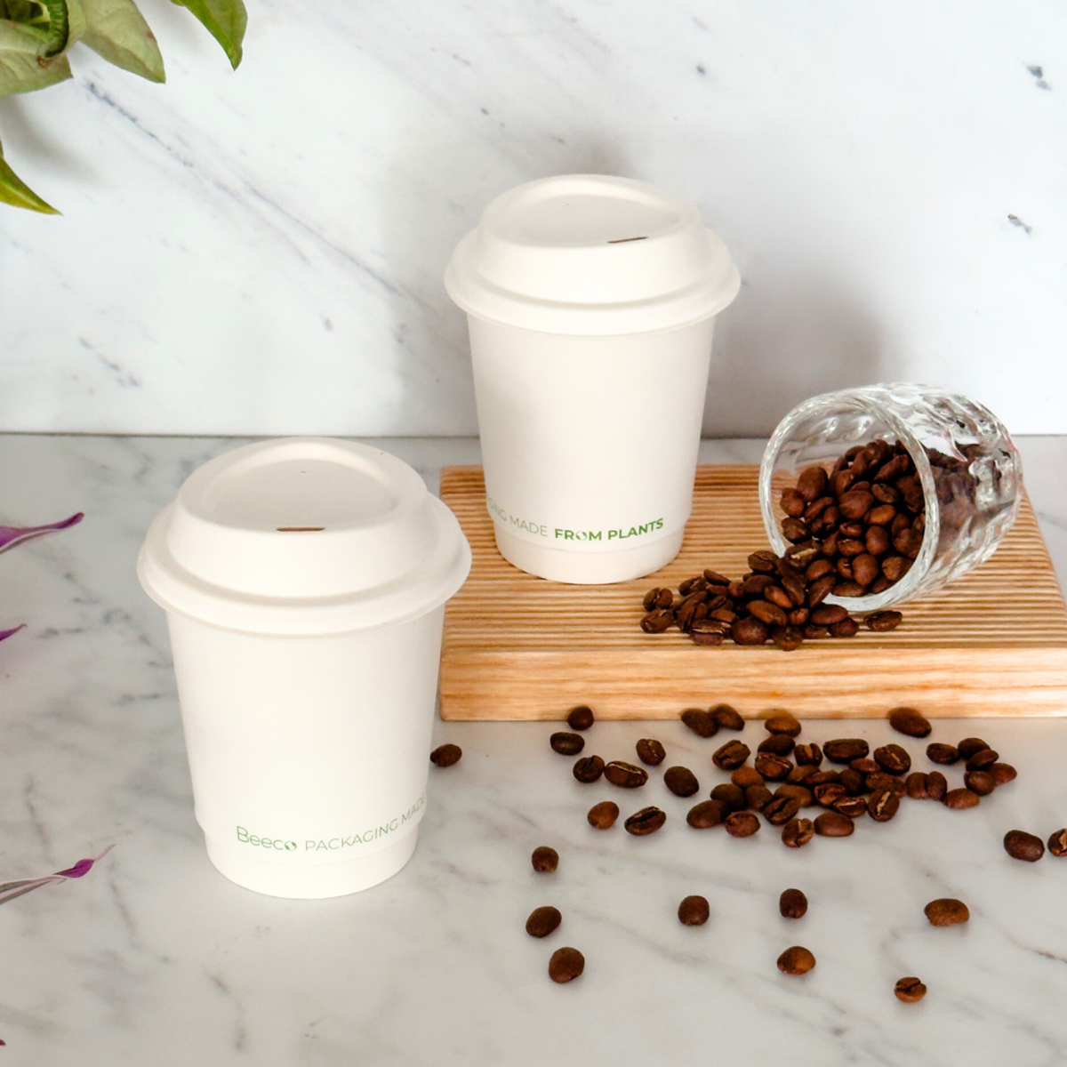 Vaso para líquidos calientes de pared doble diseño Beeco. Para café, té, sopa y todas las bebidas calientes para llevar. Revestimiento interno de PLA (a base de plantas). Comercialmente compostable donde sea aceptado.